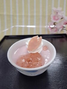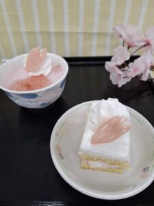 おやつは、ケーキ(イチゴジャムのゼリーを間に飾りつけには桜をイメージしたチョコをトッピング)