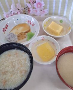 お食事形態の異なる皆様には「鮭粥・鶏肉のムースあんかけ・レンコン・ブロッコリーのムース・ゆかり味のマッシュポテト・卵豆腐・呉汁風味噌汁・フルーツゼリー」と普段より盛りだくさんの工夫を凝らした献立内容を提供させていただきました。