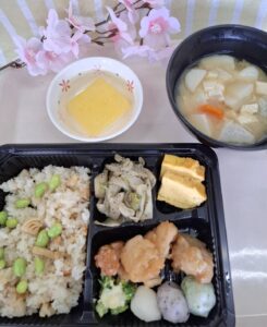 「たけのこご飯・唐揚げ・だし巻き卵・三色団子・キャベツの胡麻和え・けんちん汁・フルーツゼリー」と季節を感じていただける献立内容に、ご利用者の皆様も喜んでいらっしゃいました。